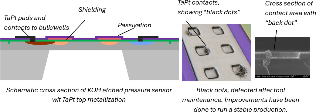 MEMS pressure sensors, one of the oldest but most frequently used micro-system devices, are still acquiring new fields of application. One such field is harsh environments, such as high temperatures, exhaust or air conditioning or cooling systems with direct contact with related aggressive and corrosive media of which pressure needs to be measured for related control systems. While the silicon carrier and membrane of MEMS pressure sensors are chemically very stable, as are the related insulating layers made from thermally grown oxide, a special solution for electrical wiring metal, which is aluminium or aluminium alloys in standard applications, is needed. The solution here is to use a stack of tantalum as a barrier and adhesion layer instead of aluminium, and platinum and gold as corrosion-free metals for the signal lines in the sensors and at the bond pads to wire to the outer signal conditioning electronics (ASIC, PCB). This change in the metal system also affects the contact to the silicon, in which the piezo resistors acting as strain gauges are realised by ion implantation directly in the silicon. Here, a slight and well-defined alloying of the tantalum and in the complete stack is required, but without full diffusion, especially into the silicon of the piezo resistors. A certain diffusion is needed for low contact resistance, while too much diffusion would destroy the contacts. This special contact conditioning is realised by a rapid thermal process (RTP). The challenges and solutions concerning the interaction between the tantalum thickness and the RTP temperature as well as its control, especially with respect to achieving a stable production solution, will be described in this contribution.